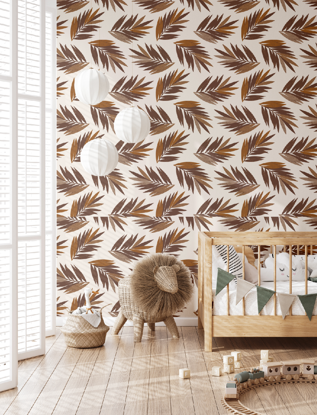 Our Tiny Palms wallpaper is a more organic spirited wallpaper. The lightly distressed palm leaves are a repeating pattern overlaid on a pearl blush ground color which allows for the brown and copper leaves to truly stand out.